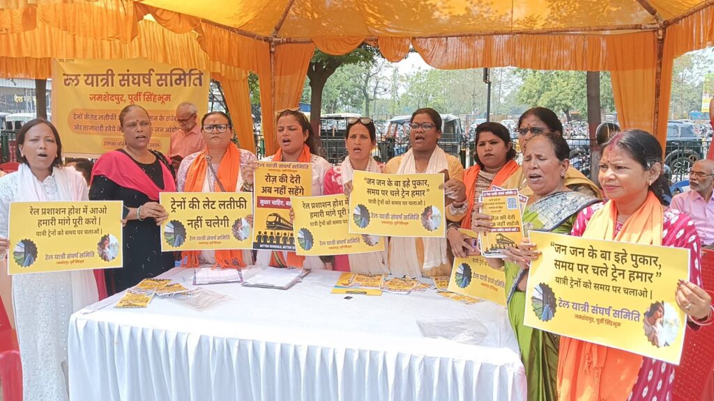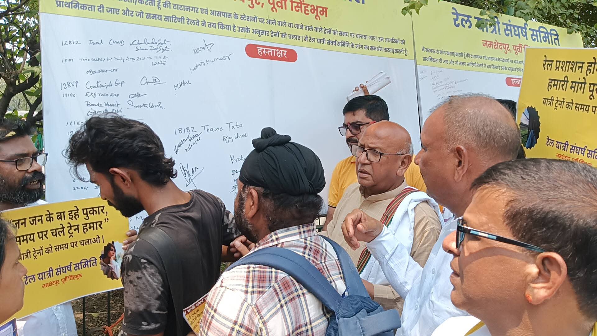 Jamshedpur. टाटानगर रेलवे स्टेशन पर रविवार को रेल यात्रियों का आक्रोश खुलकर सामने आया, जब रेल यात्री संघर्ष समिति के बैनर तले ट्रेनों की लगातार देरी के खिलाफ व्यापक हस्ताक्षर अभियान चलाया गया। स्टेशन परिसर में आयोजित इस अभियान में सैकड़ों यात्रियों ने भाग लेकर रेलवे की लचर व्यवस्था पर नाराजगी जताई और समयबद्ध ट्रेन संचालन की मांग उठाई।