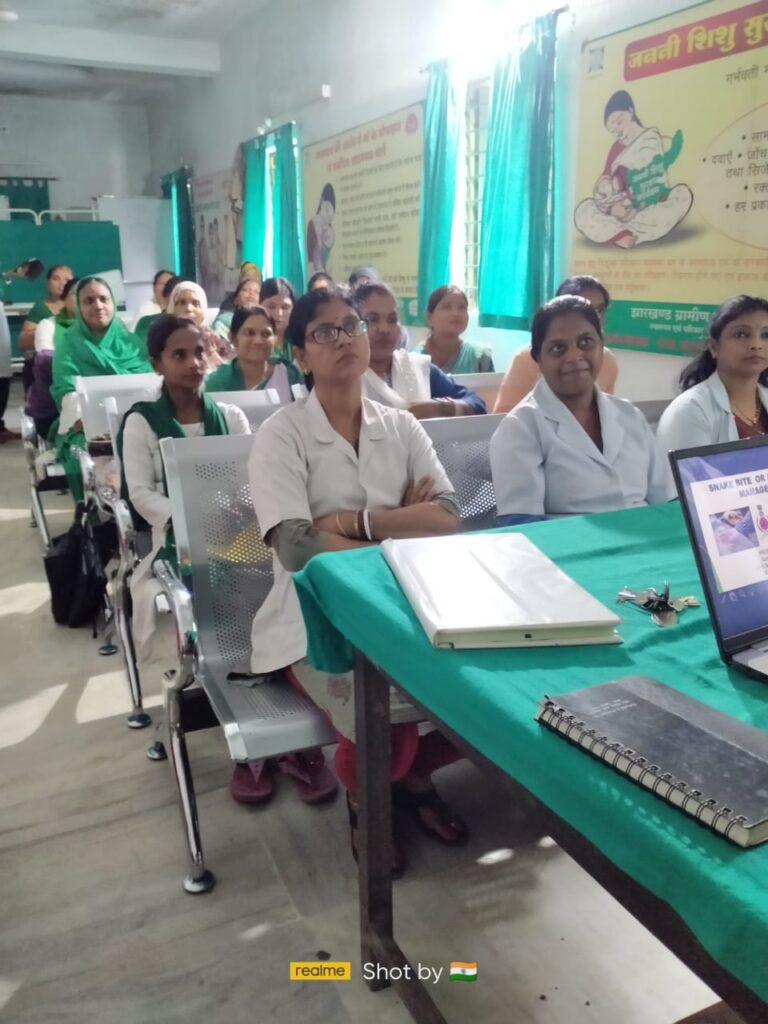 प्रशिक्षण सत्र में ANM, JNM, Cold Chain Handler, लैब टेक्नीशियन, सहिया बहनें और सहिया साथी शामिल हुए। उन्हें विषैले व गैर-विषैले सांपों की पहचान, उनके लक्षण और प्राथमिक उपचार की विस्तृत जानकारी प्रोजेक्टर के माध्यम से दी गई। साथ ही, कुत्ते के काटने से होने वाली रेबीज बीमारी की जानकारी टेलीफिल्म दिखाकर दी गई।