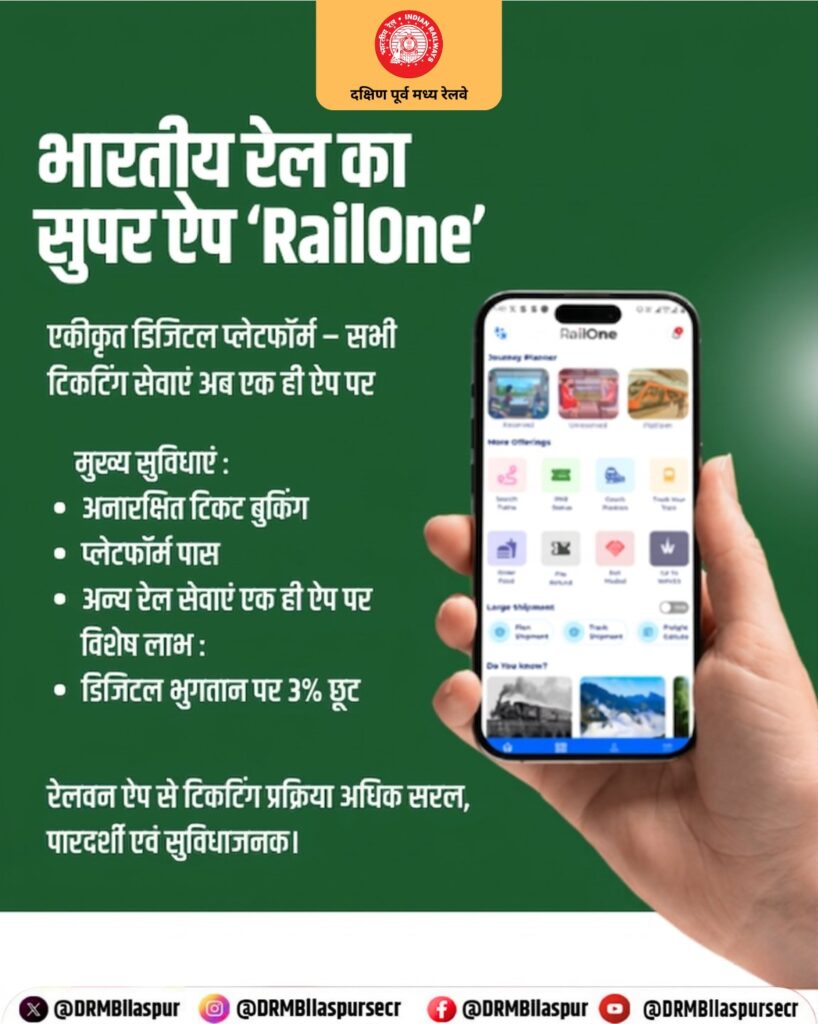 यात्रियों से आग्रह है कि वे डिजिटल इंडिया अभियान के अंतर्गत उपलब्ध इन आधुनिक सुविधाओं का अधिक से अधिक उपयोग करें तथा RailOne ऐप डाउनलोड कर अपनी यात्रा को और अधिक सुविधाजनक एवं सुव्यवस्थित बनाएं।