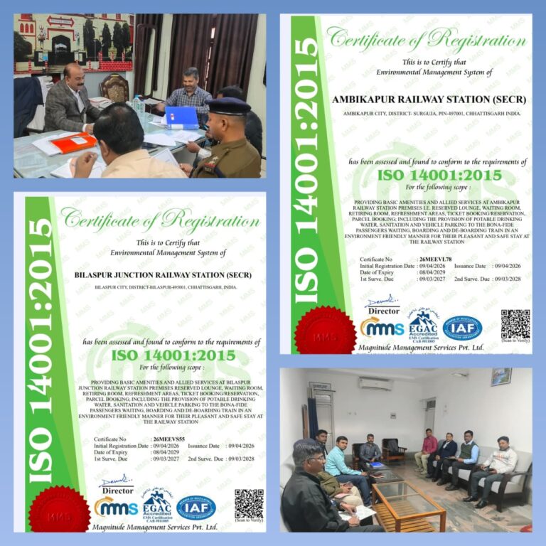 भारतीय रेलवे की ‘स्वच्छ रेल, स्वच्छ भारत’ परिकल्पना को साकार करते हुए दक्षिण पूर्व मध्य रेलवे के बिलासपुर मंडल ने पर्यावरण प्रबंधन के क्षेत्र में एक उल्लेखनीय एवं ऐतिहासिक उपलब्धि अर्जित की है। मंडल के 09 प्रमुख रेलवे स्टेशनों को अंतरराष्ट्रीय मानकों के अनुरूप ISO 14001:2015 पर्यावरण प्रबंधन प्रणाली का प्रतिष्ठित प्रमाण पत्र प्राप्त हुआ है।
