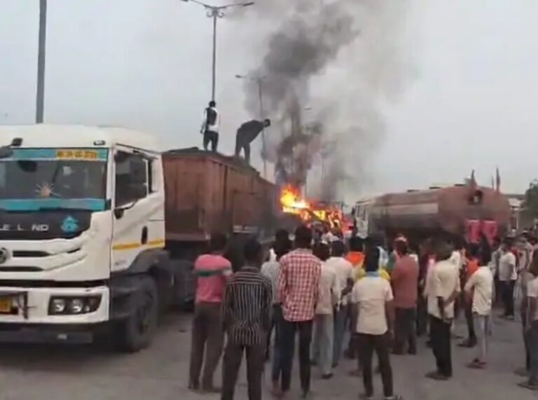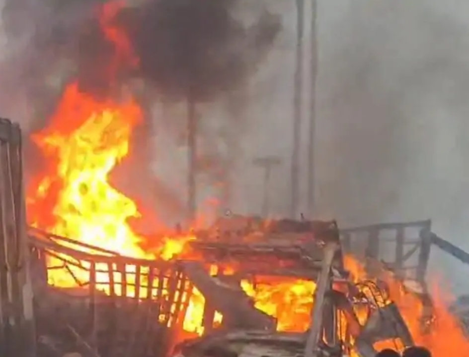 Giridih.गिरिडीह में गुरुवार की सुबह तीन ट्रकों की टक्कर होने से उनमें आग लग गई। इस हादसे में एक ट्रक के ड्राइवर और खलासी गाड़ी में दब गए और वो बाहर नहीं निकल सके। कुछ देर बाद उनकी जलने से मौत हो गई। घटना डुमरी कुलगो टोल प्लाजा के पास हुआ। हादसे में दो ट्रक पूरी तरह जलकर राख हो गए, जबकि एक ट्रक आंशिक रूप से क्षतिग्रस्त हो गया। मृतकों की फिलहाल पहचान नहीं हो सकी है।दरअसल, टोल प्लाजा के पास सड़क किनारे कई ट्रक खड़े थे और उनके चालक उपचालक उसमें आराम कर रहे थे।